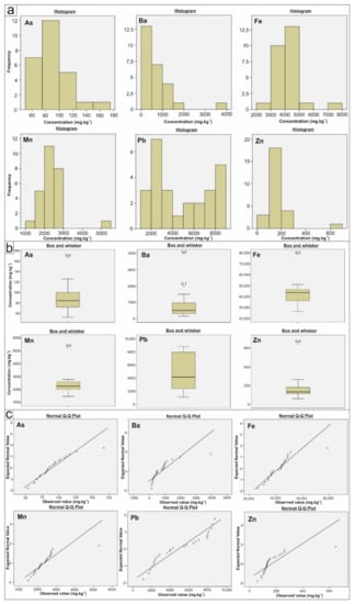 The histograms, box-and-whisker plots, and Q-Q plots indicated that the contents of As, Fe, and Mn presented normal behaviour, except for the presence of some extreme values. However, Ba, Pb, and Zn showed lognormal behaviour.
