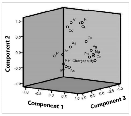 Figure 6 shows the grouping of the different variables in a space rotated in three dimensions (components), which represents 68% of the variance. In this way, we can see the position of each variable influenced by the three PCs. The associations produced are the same as those obtained in the rotated matrix (Table 4). For Component 1, the most saturated variables are Ag, Ca, Cu, chargeability, Mg, and Pb, with Ca and Mg superimposed. In the case of Component 2, they are Co, V, Cr, and Ni. Finally, Component 3 is formed by Ba, Fe, and Mn.