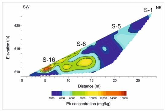 Equation (1) was used to estimate the Pb content from the 342 resistivity and chargeability data recorded for the inside slope (Figure 3). The results obtained for the weighted estimation of the Pb content are graphically represented in Figure 7, where the image of the lead concentration along the slope profile is shown. Three ranges are differentiated for the distribution of Pb content. The first range corresponds to values lower than 4000 mg·kg−1 (the mean value of the Pb content of the sampling profile), the second ranges from 4000 to 6000 mg·kg−1, and the third corresponds to values greater than 6000 mg·kg−1. The minimum value of lead in the profile is above 1000 mg·kg−1, which exceeds the limit established by the regional (275 mg·kg−1) and Dutch regulations (530 mg·kg−1). Estimated maximums above 14,000 mg·kg−1 can be observed in the lower zone of the slope. In addition, in this medium-lower zone of the dam, there are other areas with values above 8000 mg·kg−1, which exceeds the maximum concentration obtained in the surface samples. This medium-lower zone coincides with a greater presence of whitish precipitate crusts [], characterized by a high metallic content.