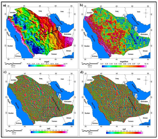 The gravity data were obtained from the global gravity field model EIGEN6C4 [71]. The EIGEN6C4 data have a higher resolution, and their error is lower than that of EIGEN6C3 and EGM2008 [72]. The EIGEN6C4 model was created using the satellite gravity data from the DTU10, GOCE, LAGEOS, and GRACE projects and available surface gravity data. The resultant grid has a resolution of approximately 3.66 km. Figure 2 shows the Bouguer gravity anomaly (BG) map after correcting the free-air gravity anomaly data from the EIGEN6C4 model. The BG map of Saudi Arabia (Figure 2a) shows a regional variation in the anomaly values that trend from lower anomaly values in the west to higher anomaly values in the east. The regional anomaly gradient contrasts with the thickening of the crust to the east [73], suggesting that this regional gravity anomaly gradient is due to lithological crust variations. Additionally, there are definite northwest–southeast and north–south trends in the majority of the anomalies, which can be related to the Neoproterozoic tectonic terranes and fault systems (Figure 1).