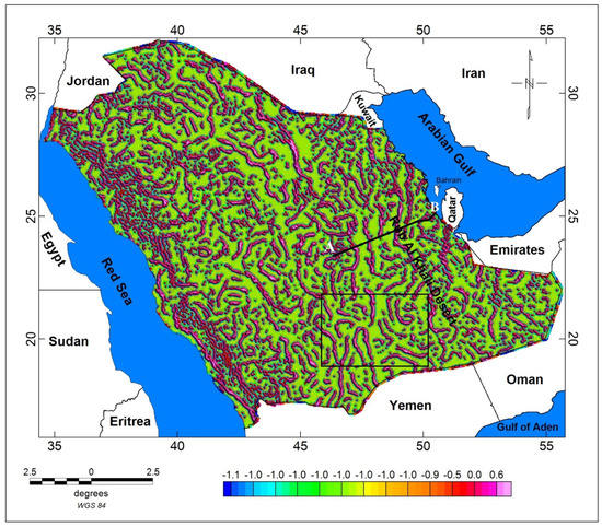 Figure 3 showed that the SF method could sharply detect important structural features. The Najd fault system (NFS) can be delineated in near-parallel lines extending from the southeastern to the northwestern sides of Saudi Arabia. The boundary between the AS, Arabian Shelf, and another area [32,33] and references therein can be sharply detected. Moreover, the main sutures and shear zones separate the AS terranes. Multiple intersection zones and high, abrupt curvatures in the structures can be delineated from the SF map (Figure 3).
