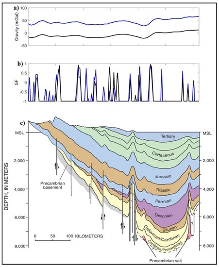 (a) Bouguer gravity data (blue line) and 4 km upward-continued Bouguer gravity data (black line) of profile AB shown in Figure 2a and Figure 6a. (b) SF of Bouguer gravity data (blue line) and SF of upward-continued Bouguer gravity data (black line) of profile AB shown in Figure 3 and Figure 7. (c) Geologic cross-section across the study area showing basement-reverse faults and Precambrian (Infracambrian) salt. Modified from [80,81,82].