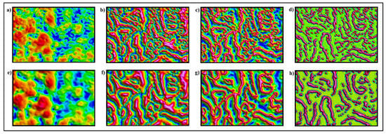 Filter anomalies of the region are highlighted in Figure 2, Figure 3, Figure 6 and Figure 7: (a) ASg of BG (Figure 2b); (b) TM of BG (Figure 2c); (c) TDX of BG (Figure 2d); (d) SF of BG (Figure 3); (e) ASg of 4 km UPC (Figure 6b); (f) TM of 4 km UPC (Figure 6c); (g) TDX of 4 km UPC (Figure 6d); (h) SF of 4 km UPC (Figure 7).