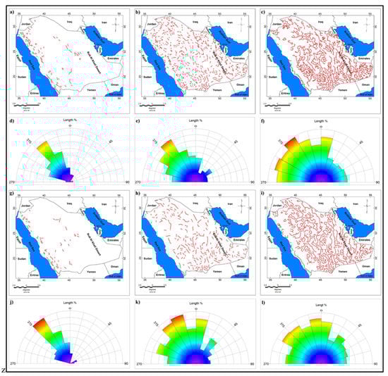Lineament maps of the maxima anomalies using the BG data from the various filters: (a) ASg; (b) TM; (c) TDX, as well as Rose diagrams of the orientations of BG-generated lineaments: (d) ASg; (e) TM; (f) TDX. Lineament maps of the maxima anomalies using the 4 km UPC data from the various filters: (g) ASg; (h) TM; (i) TDX, as well as Rose diagrams of the orientations of the 4 km UPC-generated lineaments: (j) ASg; (k) TM; (l) TDX.