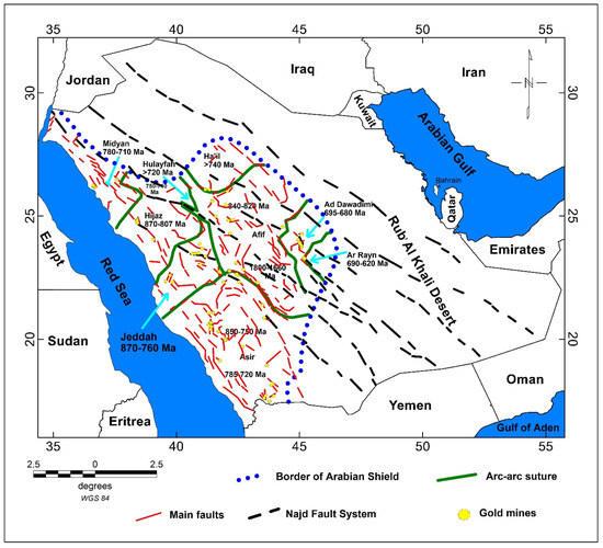 - Al-Shanti, A.M.S. Geology of the Arabian Shield; Center for Scientific Publishing, King Abdlaziz University: Jeddah, Saudi Arabia, 1993. [Google Scholar]