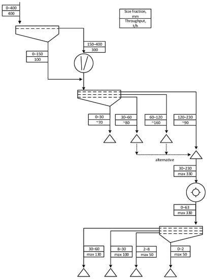 Production of mineral aggregates is realized in processing circuits that use mostly crushing and screening operations. However, these relatively simple systems require a certain control and need to be adopted to the characteristics of the feed material as well as to expected technological outcomes []. Three main groups of variables can be distinguished when an issue of improvement of work effectiveness is considered: