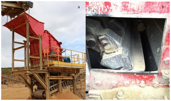 The tested impact crusher KU65-120 (Figure 2a) is the device with horizontal shaft, equipped with four blades, and powered by a 200 KW engine. Dimensions of an inlet of the working chamber are 650 mm × 1200 mm. Three consecutive gaps are in the working chamber of the crusher and each of them is adjustable, according to requirements. The last one, called the calibrating gap (Figure 2b), has the smallest width, which was subject to change in the investigative program. The first and the second gaps remained constant during experimental program and equaled 20 and 90 mm, respectively. The speed of rotor is controlled by adjustment of a specific frequency value on the thyristor box. For example, the frequency within the range 40–50 Hz corresponds to rotor velocity from 30 to 38 m/s.