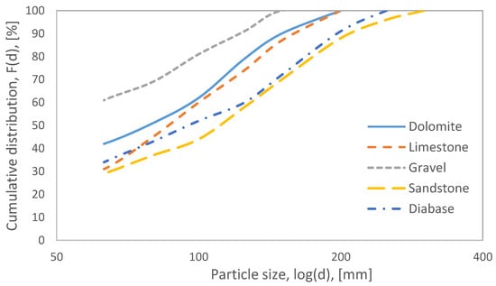 Five types of feed material were used in the testing program: dolomite (M1), limestone (M2), gravel (M3), sandstone (M4), and diabase (M5). Maximum particle size of gravel feed was 150 mm, while dolomite and limestone Dmax equaled 200 mm. Maximum size of diabase was 250 mm and the coarsest material, sandstone, was characterized with maximum particle size 300 mm. Detailed characteristics of particle size distributions of individual material types in semi-log scale are presented in Figure 3.