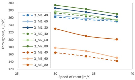 Results of throughput for various speeds of the rotor for materials M1–M3.