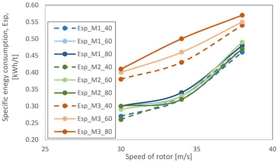 Energy consumption registered for various speeds of the rotor for materials M1–M3.