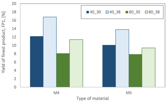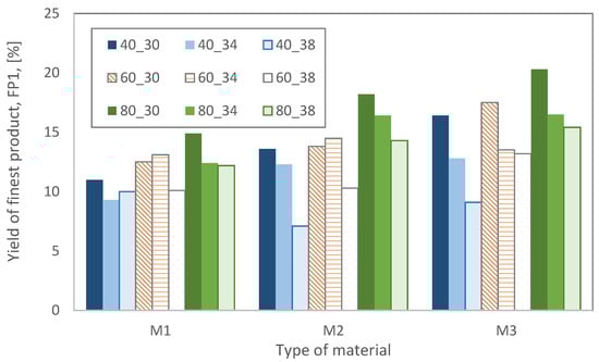 The yields of finest size fractions (i.e., below 2 mm) in individual crushing products are presented in Figure 6. The lowest content of fines was observed for the material M1, and equaled 11.72%, on average. For the limestone (M2), this value was nearly 2% higher (13.39%) and the highest value was observed for the gravel aggregate M3 and amounted to 14.97%. For the M2 and M3, a relationship between FP1 and speed of rotor is inverse, while for the material M1 it is hard to determine a clear relationship, because depending on the gap width, the relationship is parabolic or inverse. The width of the gap, in turn, is proportional to the yield of finest products, regardless of the speed of the rotor (Figure 6).