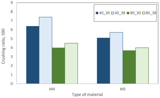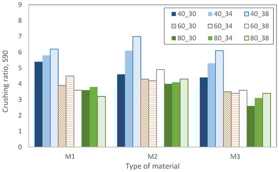 Analysis of values achieved for the 90% crushing ratio shows that the highest results were obtained for the width of gap 40 mm. Analogous values for the gaps of 60 and 40mm were significantly lower, regardless of the type of material. A significant impact of the speed of the rotor on the crushing ratio can be observed especially for M2 and M3, but mostly for the smallest gap. For 60 and 80 mm of gap values, there are rather insignificant variations observed in S90 values, both in terms of material type and the speed of the rotor (Figure 7).