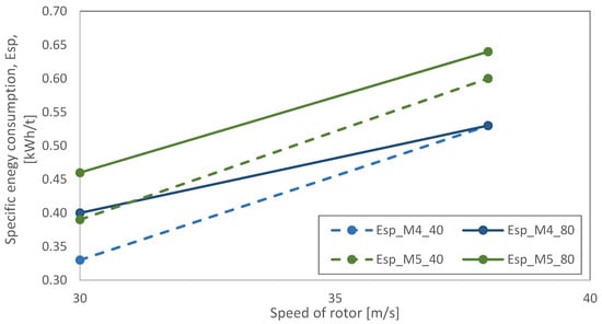 Both the relationship between a unit energy consumption and the speed of rotor appear to be proportional for all tests (Figure 5). For materials M1 and M2, an increase in the Esp together with the higher values of the speed of the rotor is more intense than for the gravel—Figure 4. On the basis of these results, it can be stated that in the case of broken aggregates the speed of the rotor has the higher impact on energy consumption than for the gravel aggregates. Processing (comminution) of these aggregates requires more input of energy, probably due to the more rounded shape of single particles, causing it to be more difficult to disintegrate them in the crushing device. The width of gap has a much less significant impact on the energy consumption than speed of rotor and can be even disregarded in this approach.