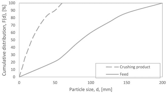 Apart from the SE calculations, a validation of models was performed. Fresh operating data on crushing the dolomite, limestone, and the gravel on plant scale was collected. Impact crusher was in operation at the speed of rotor 30 m/s and the calibrating gap width of 80 mm. Particle size distribution of the feed and crushing product for dolomite is presented in Figure 12 while more detailed results are included in Table 9.