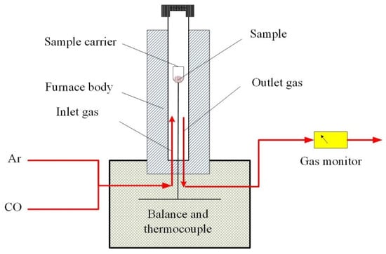 Chemical pure hematite powder with a purity of 99.0 wt.% (from Sinopharm Chemical Reagent Co., Ltd., Shanghai, China) was used as raw material. The powder was placed in the Al2O3 crucible, then it was appropriately placed on the weight sensor of the analyzer, and all the gas tubes were well sealed. Before being linearly heated, furnace atmosphere was cleansed from air with high-pure Ar gas, which was then substituted with pure CO at a flowrate of 30 mL/min. Consequently, the raw materials with masses of 370, 823, 610 and 335 mg were heated at heating rates of 3, 8, 10 and 18 K/min, respectively. When the reaction temperature was heated to 576 °C, the material was cooled to room temperature in an inert Ar atmosphere.