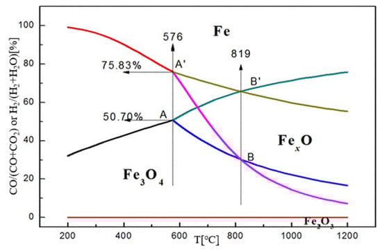 As shown in Figure 2, the reduction products of hematite are determined by reaction temperature and partial pressure of reduction gas. Point A and point A’ in Figure 2 are three-line intersections of the reactions reduced by CO and H2, respectively. Figure 2 can be divided into three parts by point A. On the upper left part of point A, the expected reduction product is Fe; on the right part of point A, FexO is thermodynamically stable. Below the point A, Fe3O4 is thermodynamically predominant. As a result, the low-temperature reduction of hematite includes two processes, i.e., Fe2O3 → Fe3O4 and Fe3O4 → Fe.