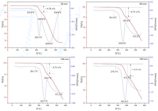 The TG curves and DTG curves of the experimental data are shown in Figure 3.
