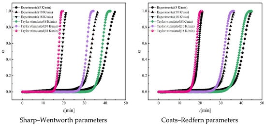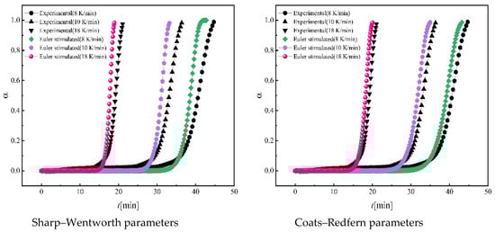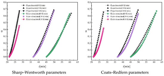 For a group of experimental data, the activation energy, reaction order, and the pre-exponential factor are gained in advance, since the left-hand side of Equation (7) can be integrated and the right-hand can be solved by using the recursive method, as Equations (13)–(15) demonstrated. With the help of a computer program, the calculated values of the reacted ratio against time t can be found. Finally, the kinetic processes of those experiments with other heating rates could also be numerically predicted.
