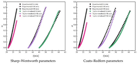 For the reaction of hematite reduced to magnetite, according to Figure 4, the results of the Coats–Redfern prediction are closer to the experimental values. The mean square errors of the Sharp–Wentworth and Coats–Redfern methods are calculated by Equation (18). Based on the formula of the mean square error, the number of nodes with heating rates of 8, 10 and 18 K/min are 70, 65 and 53, respectively.