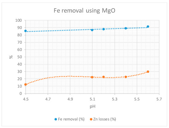 The percentage of Fe removal and the portion of Zn losses increases with pH for MgO. Iron removal varies between 85% and 92% and zinc losses are between 12% and 30%. The control of the level of supersaturation was carried out by keeping the temperature at an average of 52 °C. It was obtained 88% of iron removal and 22% of zinc losses; for a pH of 5.2.