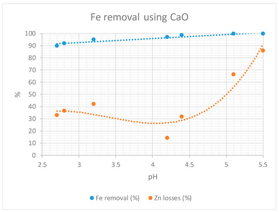 CaO presented a good performance for removing iron, but high zinc loses in the precipitated solid. Iron removal increased from 89.7% at pH 2.7 to 99.5% at pH 5.5; while zinc losses increased from 32.7% at pH 2.7 to 85.7% at pH 5.5. For this reagent, the temperature is an influencing factor on the Zn losses. In particular, the experimentation carried out at a pH of 4.2 and a temperature of 30 °C stands out, in which iron removal reached 96.9% and the loss of zinc was 14%. The highest loss of zinc was obtained for high values of pH and temperature (pH = 5.5; T = 65 °C).