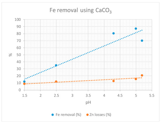The trends show the effect of pH on the removal of Fe and zinc loss, with a higher incidence of zinc losses.