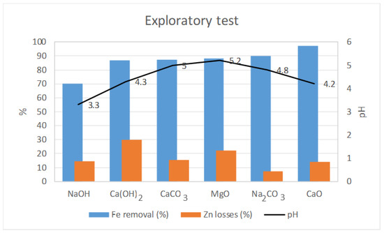 Additionally, in the exploratory stage, tests were carried out using reagent mixtures. In general terms, good results were not achieved. The lime/soda mixture stood out in a ratio of 0.25/0.75, in which a 90% removal of Fe and 28% loss of Zn was achieved at a pH of 2.7 and a temperature of 60 °C. With this mixture, the viscosity of the pulp generated is reduced, favoring the phase separation stage.