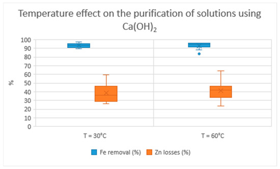Figure 13 and Figure 14 present box and whisker plots that show the effect of pH and temperature on iron removal and zinc losses, using Ca(OH)2. To have more information, tests with pH = 5 were added to the data used for the analysis of variance, keeping the other variables at the defined levels: temperature 30 °C and 60 °C; stirring speed 300 rpm and 400 rpm; time 10 min and 20 min. The results of 24 experimental treatments are presented.