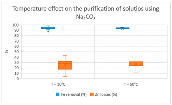 The temperature has practically no influence on iron removal. In the case of zinc losses, a minimal impact on the averages is observed; nevertheless, there is a more excellent dispersion of the data. This is explained considering the effect of temperature-stirring, stirring-time, and temperature-stirring-pH interactions. The following treatment results should be noted: for a pH = 4, T = 60 °C, stirring speed = 300 rpm and operating time = 10 min, 88.1% of iron removal and 23.7% of zinc losses is obtained. These results can be improved by a previous oxidation process and provide information for designing the purification process of industrial solutions.