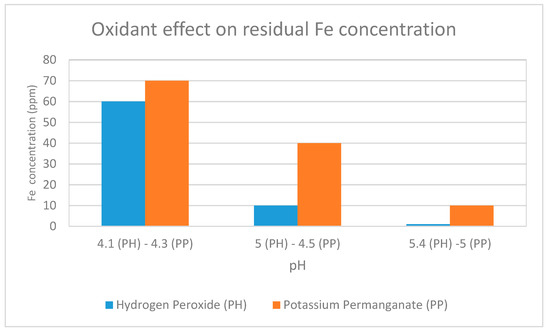Figure 17 shows the effect of the oxidant on the residual iron concentration and Figure 18 shows the result of the oxidant on zinc losses. The pH ranged between 4.3 and 5.4; for potassium permanganate, the pH ranged between 4.1 and 5.