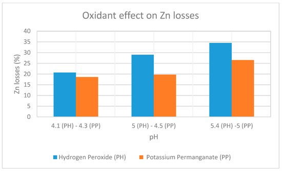 Considering the results obtained in the 24 experimental treatments carried out for Ca(OH)2, to iron removal and zinc losses, and, taking into account the estimated phase separation time for 1 pilot-scale batch operation and the low cost of the reagent, an oxidation stage was incorporated before the solution purification process. According to what was indicated in the methodological aspects, H2O2 and KMnO4 were used, applying the reagents in the dosages indicated in said section. The oxidation reactions are presented in Equations (1) and (2).