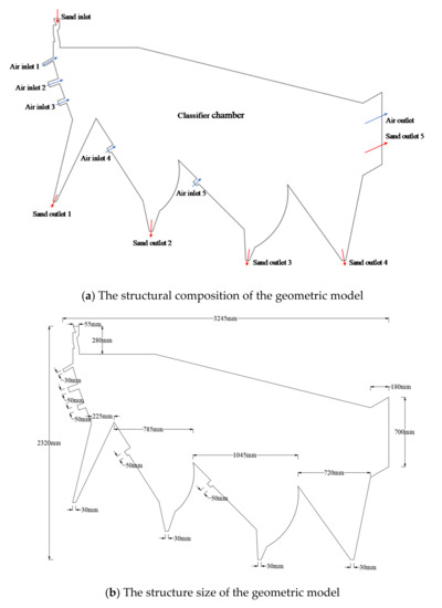 The geometric model of the air classifier simulated in this paper is shown in Figure 1a,b, respectively, and shows the structural composition and size of the geometric model. The model was designed and made by Guizhou Railway Construction Technology Development Co., Ltd., Guiyang, China. The equipment is a multi-air inlet structure, 3.245 m long, 2.320 m high, with a thickness of 1 m. The model structure remains unchanged in the thickness direction. It contains one sand inlet, five air inlets, one air outlet, and four sand outlets. The sand inlet is 55 mm wide, the air inlet 1 is 30 mm wide, the remaining air inlets are both 50 mm wide, the air outlet width is 700 mm, and the sand outlets are all 50 mm wide. The inclined sidewall at the air inlets 1, 2, and 3 can fit the particle trajectory of sand so that the airflow can more effectively affect the sand movement. The airflow at air inlets 4 and 5 can effectively prolong the movement time of 0~1.18 mm sand, increase its lateral displacement and make its classification more sufficient. Sand with different particle sizes can be separated into the specified sand outlet by adjusting the air velocity at the air outlet and five air inlets.