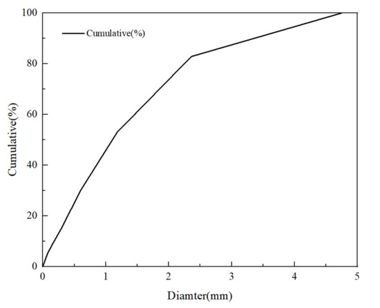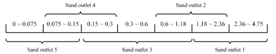 Table 1 and Figure 2 show the particle size distribution of the fed manufactured sand. In the table, in accordance with construction engineering norms, the sand is divided into seven particle sizes according to the diameter. The particle size distribution of manufactured sand is continuous and wide, which limits its classification accuracy. This equipment cannot accurately separate the sand of each particle size grade by classifying it only once. It performs cross-particle size classification, as shown in Figure 3. Each outlet collects sand of two or three particle size ranges. After that, simple secondary separation can be used to accurately separate the sand discharged from each outlet. The standard of the target separation particle size and the separation rate of each sand outlet are shown in Table 2. The separation rate is obtained by dividing the cumulative mass of the target particle size at the sand outlet by the gross mass. Since the sand outlet 4 is farthest from the sand inlet and air inlets, it is difficult to control the particle size composition of the collected sand. In addition, the amount of sand collected here is small, so the target separation rate of outlet 4 is not strictly required.