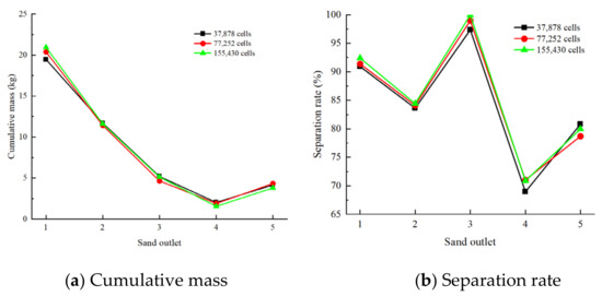 Figure 4 shows the simulation model, the sand inlet, air inlet, and air outlet are red, and the sand outlet is yellow, the whole domain was divided into 37,878 cells. As shown in Figure 5, the simulation model was chosen after the mesh independence test. Models with grid numbers of 37,878, 77,252, and 155,430 are used to simulate the air flow classification process, according to the conditions in Table 3 and Table 4. We can see that the cumulative mass and separation rate between the model of 37,878 cells and other models are very similar. Reducing the number of grids can greatly reduce the simulation time, so 37,878 grids were chosen to simulate the air flow classification process of manufactured sand in this paper.