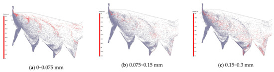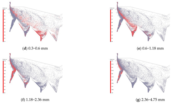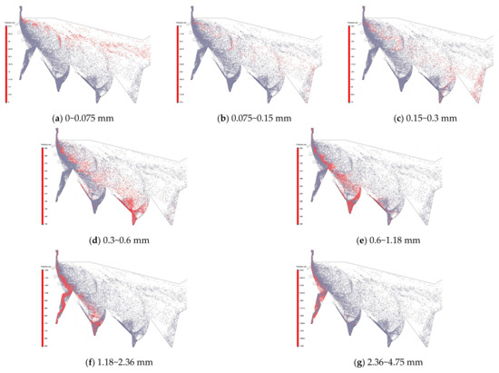 Table 4 is the original scheme, which is a preliminary determination of the airflow velocity combination used for manufactured sand classification after several simulations. Where V1~V5 are the airflow velocity of the sand outlet corresponding to the number, and V6 is the airflow velocity of the air outlet. Since the air inlet 5 is located on the upper side of the sand outlet 3, it can only affect the distribution of 0–0.6 mm sand and a minor portion of 0.6–1.18 mm sand. The mass of it accounts for less than 50% of the total sand, so the velocity here is set to be small. The simulation results of the airflow velocity scheme are obtained and processed. Figure 6 is a distribution map of sand in each particle size range during the classification process, in which the red part represents the particles within the particle size range. Each sand outlet collects two or three particle size ranges, as shown in Figure 3. In Figure 6, the sand sorted by outlet 1 is (f) and (g), outlet 2 is (e) and (f), outlet 3 is (d) and a small amount of (c) and (e), outlet 4 corresponds to (b) and (c), outlet 5 is the particle size shown in (a) and (b).