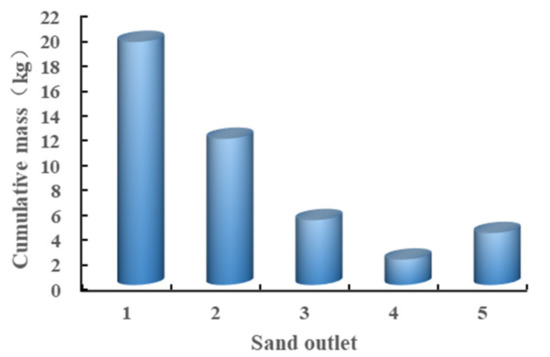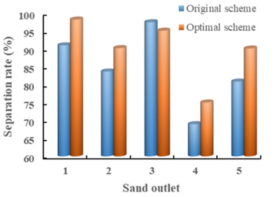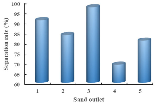 Figure 7 shows the cumulative mass of sand at each sand outlet. We can find that the sand is mainly concentrated in outlets 1 and 2. This is because the mass of coarse and medium-coarse sand collected at the two outlets accounts for a large proportion. The remaining sand is collected at outlets 3~5, of which the sand at outlet 4 is the least. Figure 8 shows the simulation results of each sand outlet’s separation rate of the target particle size under the original scheme. According to the sand distribution, the classification ability of the multi-air inlet structure is improved compared with the traditional single air inlet structure, and the sand can be subdivided according to the particle size grade. The air inlets at different positions can affect the whole classification process of sand. Comparing the sand distribution and separation rate, we can see that the separation effect of sand outlets 1 and 3 is better and meets the design requirements. In contrast, the separation rate of the remaining sand outlets does not reach the target. We can find the reason from Figure 6 that the 0.3~0.6 mm particles are too dispersed during the separation process and are distributed in outlets 2~4. Although outlet 3 has the highest separation rate, it has a poor separation impact for sand with a diameter of 0.3~0.6 mm. Some 0.3~0.6 mm sand is blown to outlet 4, so outlet 4 has the poorest separation rate. Meanwhile, particles with a particle size of 0.15~0.3 mm are blown to outlet 5 due to excessive airflow velocity, reducing the separation rate.