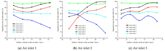 Figure 9 shows the changing trend in the separation rate of manufactured sand at each sand outlet when the airflow velocity at the air inlets 1, 2, and 3 changes. By comparison, it is found that the change in the airflow velocity at air inlet 2 has the most significant impact on the overall airflow classification effect. The increase in the airflow velocity of each air inlet and outlet will improve the separation rate of sand outlets 1 and 2, and inlet 2 has the most obvious effect. When V2 increases from 24 m/s to 46 m/s, the separation rates of outlets 1 and 2 rise from 75.35% and 55.39% to 99.75% and 91.53%, respectively. The reason is that the medium-grain (0.15~1.18 mm) sand content in outlets 1 and 2 is reduced. Meanwhile, we can see that the change in airflow velocity at the air inlets 1, 2, and 3 has little effect on the sand separation at outlets 3 and 5, but the impact on outlet 4 is significant. For example, the increase in V1 and V2 caused the sand outlet 4 separation rate to fall from 77.85% and 81.41% to 56.55% and 48.38%, respectively. Since the cumulative mass of sand in outlet 4 is tiny, a change in particle size distribution can easily impact its separation rate.