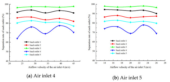 Figure 10 is a comparison diagram of the variation curves of the separation rate of each outlet when the airflow velocity of air inlets 4 and 5 changes. It can be seen from Figure 10 that the change in the airflow velocity has little effect on the overall separation effect. At the same time, by comparing the separation rate of sand outlet 4, we can see that the changes of V3, V4, and V5 will cause the separation rate of the outlet to show an unstable wave-shaped change trend.