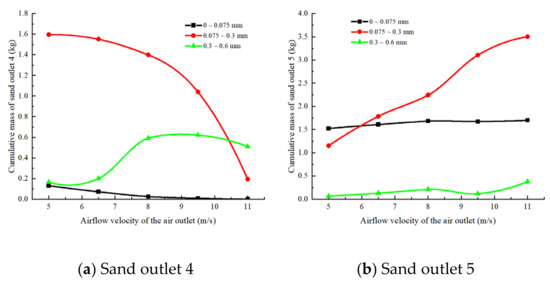 Figure 11 shows the variation curves of the separation rate of each outlet under the change in the airflow velocity of the air outlet. We can see that changing the velocity of the outlet airflow has a big impact on the separation rate of each sand outlet. The separation rate of sand outlets 1, 2, and 3 will increase synchronously with the airflow velocity. When the airflow velocity increases to 11 m/s, the separation rate of outlets 1 and 2 increases to more than 92%, and the separation rate of outlet 3 even reaches 99.82%. On the contrary, the separation rate of sand outlets 4 and 5 decreases significantly with increased airflow velocity. When V6 = 11 m/s, the separation rate reaches its lowest, and the downward trend is also the most obvious. Figure 12 shows each particle size’s cumulative mass change diagram at sand outlets 4 and 5. We can find that when the airflow velocity at the wind outlet increases, a large amount of fine-grained (0.075~0.3 mm) sand is blown from sand outlets 4 to 5, resulting in a significant reduction in the separation rate.