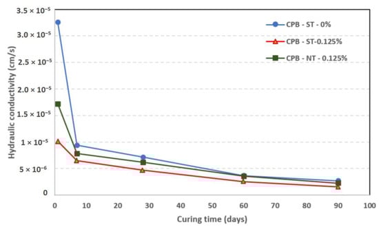 Evolution of hydraulic conductivity in CPB made with ST and NT.