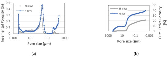 The hydraulic conductivity of the CPB showed a consistent decrease for all samples over the curing period regardless of the tailings type and the superplasticizer content, as observed from Figure 2. The influence of curing time was largely dependent on the progression of cement hydration. Generally, the cement continues to undergo a chemical reaction in the presence of water leading to the production of compounds (e.g., ettringite, C-S-H, CH) that modify the pore structure of the CPB [,,,]. In effect, the spaces between the solid particles shrink as a result of the refinement and that would make the CPB less permeable. This can be noticed from the MIP graphs showing the distribution of pores in CPB specimens tested at different curing ages (Figure 3). Both incremental porosity and total pore volume were much higher in the CPB cured for 7 days. To further confirm the difference in the hydration products, cement paste samples with different curing times were subjected to thermal analyses. The TG/DTG diagrams of 7 days and 28 days samples are presented in Figure 4. The DTG graphs exhibit three distinct peaks corresponding to the proportion of the hydration products that decompose within specific temperature ranges. The first peak occurred between 100 and 200 °C and it was caused by the dehydration of hydrates, such as ettringite, gypsum, and C-S-H [,]. The second peak (between 400 and 500 °C) was mainly as a result of the de-hydroxylation of portlandite (calcium hydroxide, CH), while the third peak (between 650 and 750 °C) was due to the decomposition of carbonated compounds as well as calcite [,,,]. The DTG graphs from Figure 4 indicate that there were many more hydration products (especially CH) in the cement paste cured for 28 days than that cured for 7 days. This was reflected in the TG curves as there was about 80% of the 7-day specimen remaining after reaching 1000 °C temperature as opposed to 70% of the 28-day specimen. The reduction of hydraulic conductivity of CPB based on the progression of cement hydration has also been observed by other studies (e.g., [,,,]).