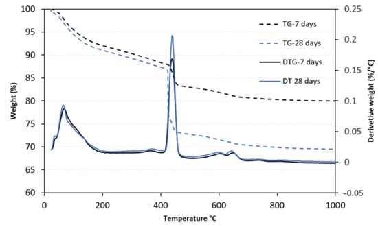 TG/DTG diagrams of pastes containing superplasticizer cured for 7 and 28 days.