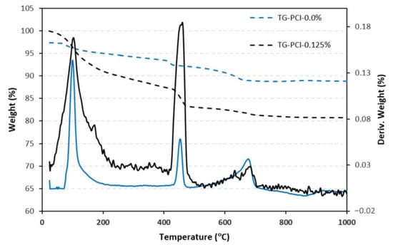 TG/DTG diagrams of 7-day cement pastes containing different superplasticizer contents.