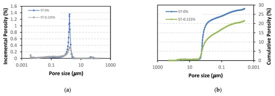Effect of superplasticizer on the (a) pore size distribution and (b) cumulative pore volume in the CPB cured for 28 days.