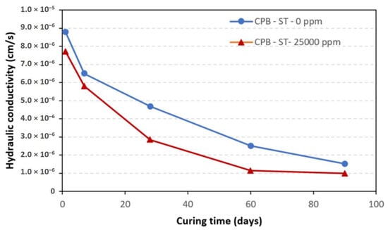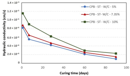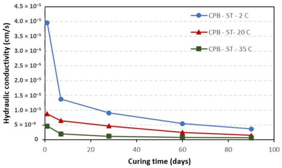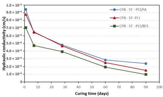 - The hydraulic conductivity of the CPB decreased with curing time regardless of the mix composition, superplasticizer content, or curing condition. It generally decreased rapidly in the early age (up to 7 days) and continued slowly beyond that;