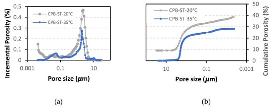 Each cemented backfill structure is unique with respect to its temperature. The temperature of the backfill is a function of several factors, such as the binder hydration heat, the initial temperature of the backfill components, the depth and geographic location of the mine []. Therefore, the impact of temperature on the hydraulic conductivity of CPB with superplasticizer was studied. Temperature was also observed to influence the hydraulic conductivity of the CPB containing superplasticizer. Figure 7 presents the evolution of the hydraulic conductivity of specimens prepared and cured at three different temperatures, 2, 20, and 35 °C. Throughout the curing period of 90 days, the CPB cured at 35 °C had the least hydraulic conductivity, followed by 20 °C, and then 2 °C. This is similar to what was observed from other studies on CPB and other cementitious materials (e.g., [,,,], and thus, the presence of superplasticizer does not change the relationship. The MIP results (Figure 8) on CPB containing 0.125% superplasticizer and cured at 20 and 35 °C temperatures were in agreement with the assertion. The quantity of large pores as well as the cumulative pore volume in the CPB cured at 2 °C was much higher than that in the CPB cured at 35 °C. A more suitable parameter that can give a better understanding on why the hydraulic conductivity is different based on the pore distribution is the threshold diameter. According to Aligizaki [], the threshold diameter, with respect to the mercury intrusion porosimetry, is the smallest pore size with geometric continuity throughout the sample, thereby allowing uninhibited intrusion. This pore diameter is approximated to be the point of inflexion on the cumulative porosity curve []. From Figure 8b, this diameter was approximately 3 µm for the 20 °C specimen and 0.08 µm for the 35 °C specimen. This means that the 35 °C-CPB has finer pore structure which translates to lower hydraulic conductivity.