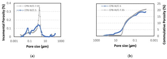 Effect of W/C ratio on the (a) pore size distribution and (b) cumulative pore volume in the CPB samples containing superplasticizer.