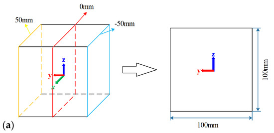 Slices of specimens in different positions. (a) Schematic diagram of section location, the specimen has a side length of 100 mm, the center of the specimen is the origin, the middle position is at 0 mm, and the sides are 50 and −50 mm each. The distribution of the fracture extension after the specimen has been loaded and unloaded several times. (b) Slices of the first CT scan. (c) Slices of the second CT scan. (d) Slices of the third CT scan. (e) Slices of the fourth CT scan. (f) Slices of the fifth CT scan.