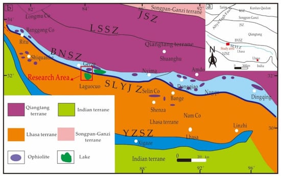 8. Wang, B.D.; Liu, H.; Wang, L.Q.; He, J.; Wang, D.; Li, F.Q. Spatial-Temporal framework of Shiquanhe-laguoco-Yongzhu-Jiali ophiolite mélange zone, Qinghai-Tibet plateau and its tectonic evolution. Earth Sci. 2020, 45, 2764–2784. [Google Scholar]