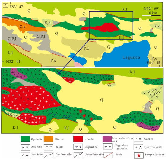 Figure 2. (a) Main geotectonic units of Laguoco. (b) Simplified geologic map of the Laguoco ophiolite, modified after [12]. C1y: Early Carboniferous Yongzhu formation; C2P1l: Late Carboniferous–Early Permian Laga Formation; P1x: Early Permian Xiala Formation; K1l: Early Cretaceous Lanon Formation; K1d: Early Cretaceous Duoni Formation; Q: Quaternary.